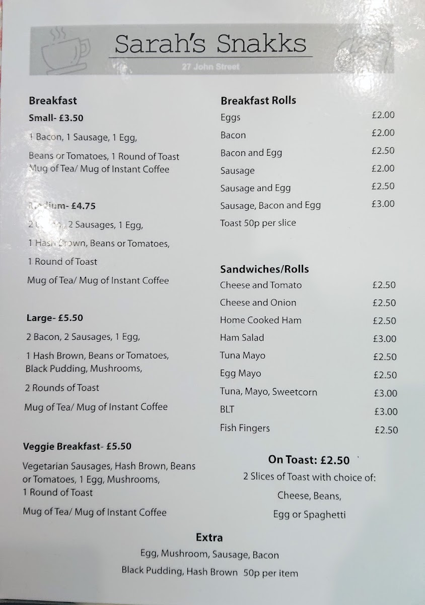 Welcome to Sarah's Snakks, a delightful café nestled at 27 John St, Porthcawl CF36 3AP in the United Kingdom. This charming eatery stands out as a beloved local spot where good food meets a warm and welcoming atmosphere, ideal for anyone looking to enjoy a comforting meal or a quick bite.